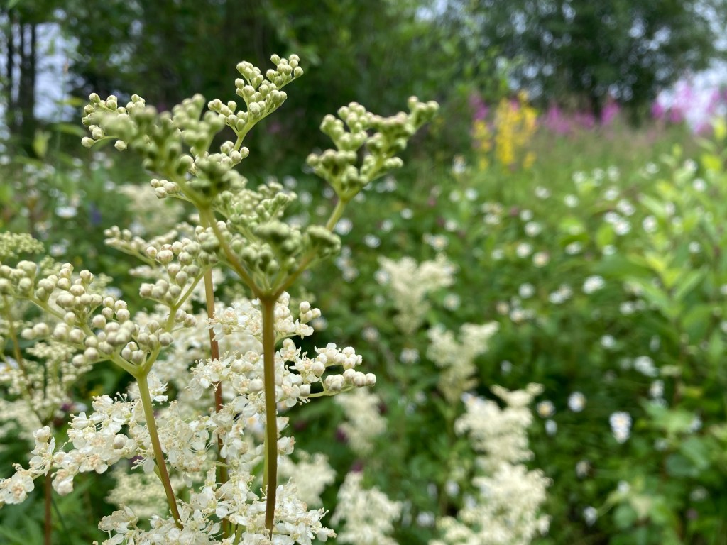 In de middag is het droog, je stuurt het jongste kind naar buiten. Je stelt voor om minstens tien verschillende soorten bloemen te plukken. Tijdens de lange treinreis vanuit de hoofdstad zagen jullie een paarse bloemenzee langs de spoorlijn; de monnikskap die overal bovenuit piept, en wel tot je middel kan groeien. Hier valt de moerasspirea op: de plantjes met witte bloesem groeien overal, ze zijn als een sluier in de bermen gedrapeerd, en wiegen zo mooi in de wind.