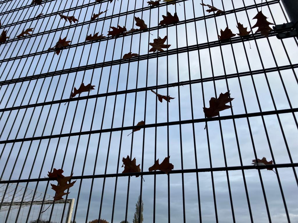 Dan loop je naar buiten, het oudste kind speelt op veld drie in haar oranje tenue. In deze masculine wereld, waarin de mannen in het bestuur zitten en de vrouwen kantinedienst draaien, en er ook op de socials veel meer aandacht is voor de jongens dan voor de meiden – in deze wereld speelt het kind haar wedstrijd. En ze wint. Je loopt er naartoe, tussen de koffies en de thee en de limonade. In het hek rond het veld hangt bruin blad tussen de spijlen. Alsof een vogelverschrikker op lange benen het er in de nacht heeft ingegooid. Dan breekt de zon door, de mist is verdwenen.