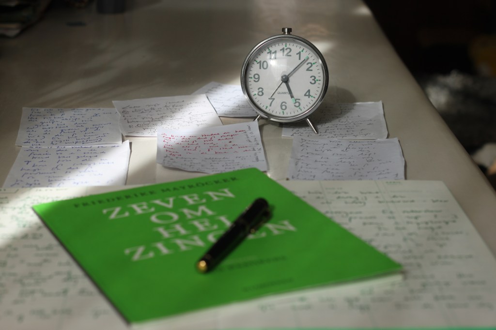 En je denkt: schrijven tussen de hagelslag en de vieze yoghurtkommen. Je bent nog in pyjama, je laat de afwas wachten. Je moet eerst zinnen noteren op losse papiertjes voor ze verdwijnen. Nieuwe verhalen zonder plot die in rode en groene inkt worden geschreven. Iemand zingt opera, een Russisch lied, een zware schooltas wordt omgegord. Hoe de ochtend voorbij glijdt, het huis leegraakt en zich weer vult. En je nog steeds in je lichtgroene pyjama met het oude grijze vest erover. Het is soms onduidelijk waar je nodig bent, maar je zit hier en je schrijft. Je probeert bij de gedachte te blijven, een kiem en sprank een glimp van iets nieuws. En je bent geen mens dat kan toveren, maar je voelt dat er iets komt, en dat het meer is dan één zin die voor eeuwig onzichtbaar onderaan de tafel staat.